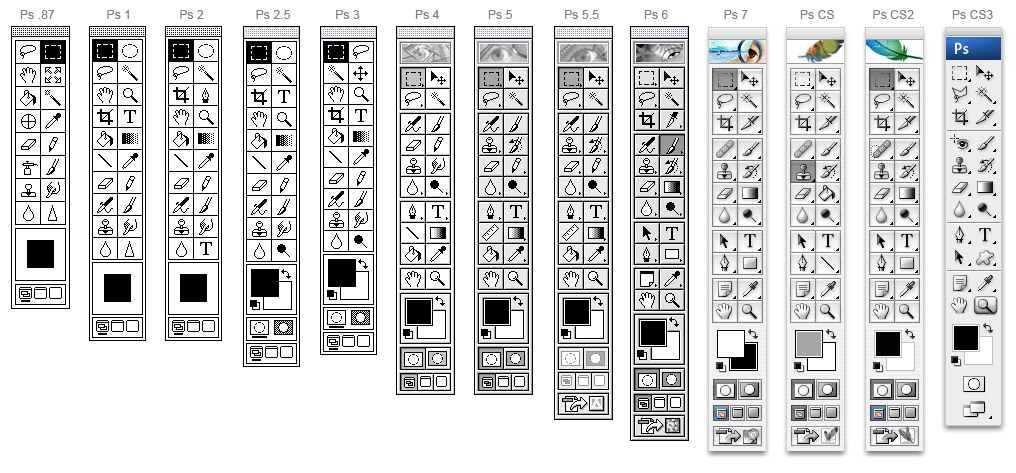 ooh qué bonita comparativa! no recuerdo en qué versión empecé a usar el photoshop, pero me ha encantado ver esta evolución comparada